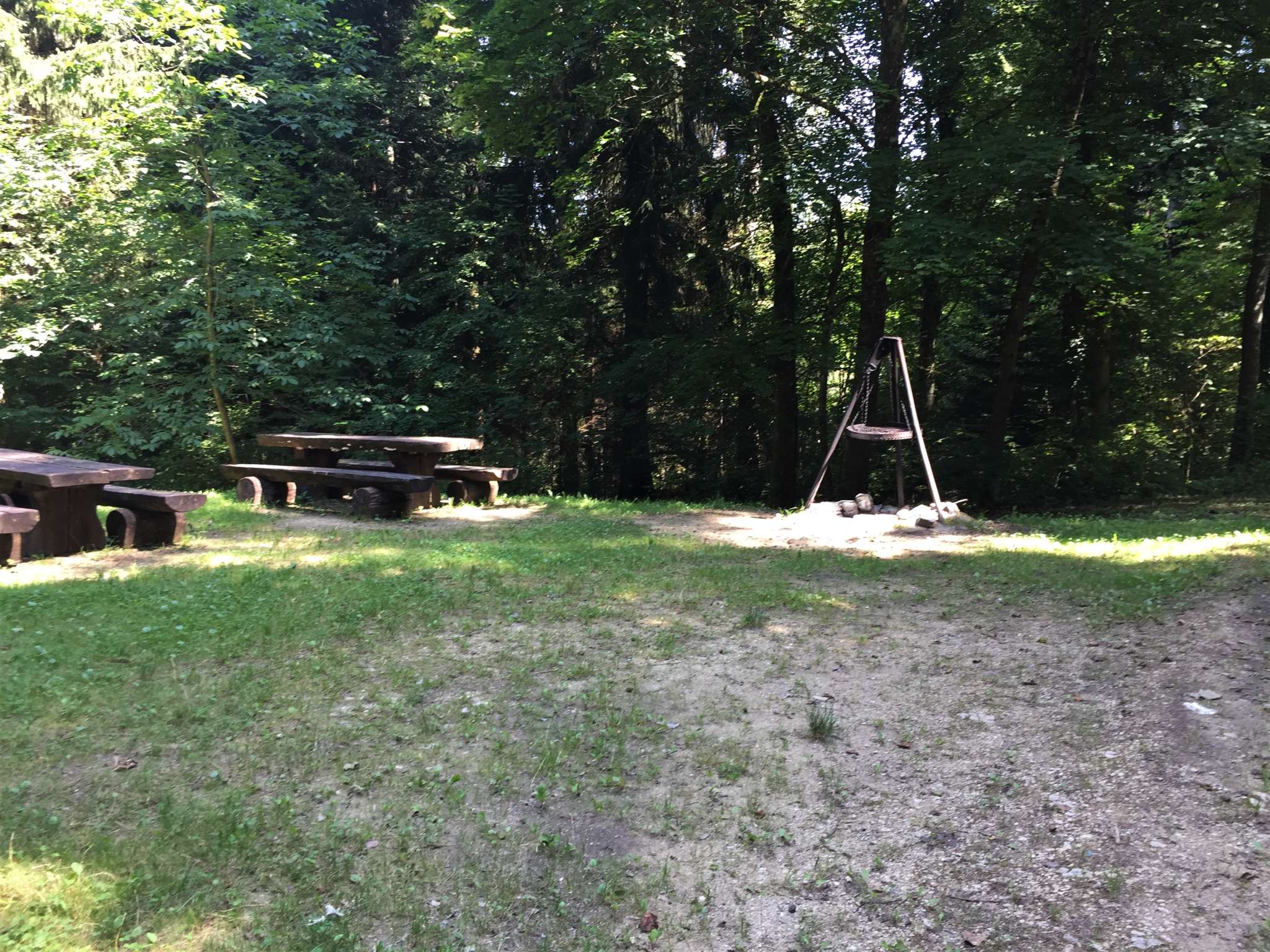 Der Grillplatz bei der Blockhütte hat eine offene Feuerstelle und zwei Tischbänke. Der Unterstand der Hütte darf genutzt werden.