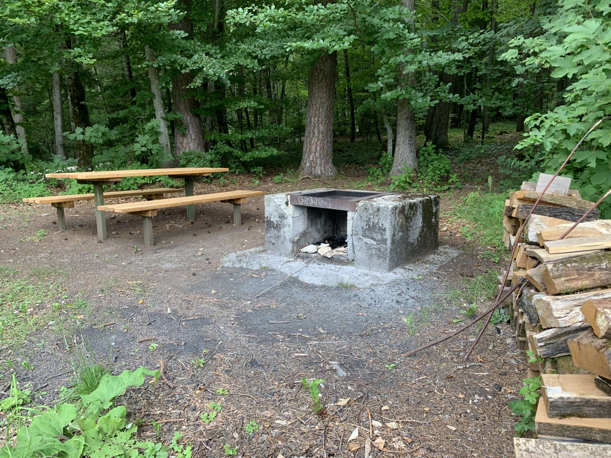 Ein Picknick-Tisch sowie eine Feuerstelle laden zum Grillieren und Picknicken ein. Mit etwas Glück hat es Holz bei der Grillstelle. Dies ist jedoch nicht zwingend.