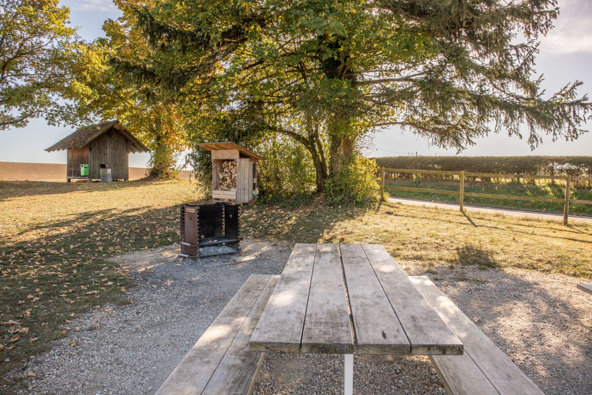 Neben einer Feuerstelle, zwei Tischen mit Bänken sowie schattenspendenden Bäumen hat es auch Holz (ohne Gewähr).