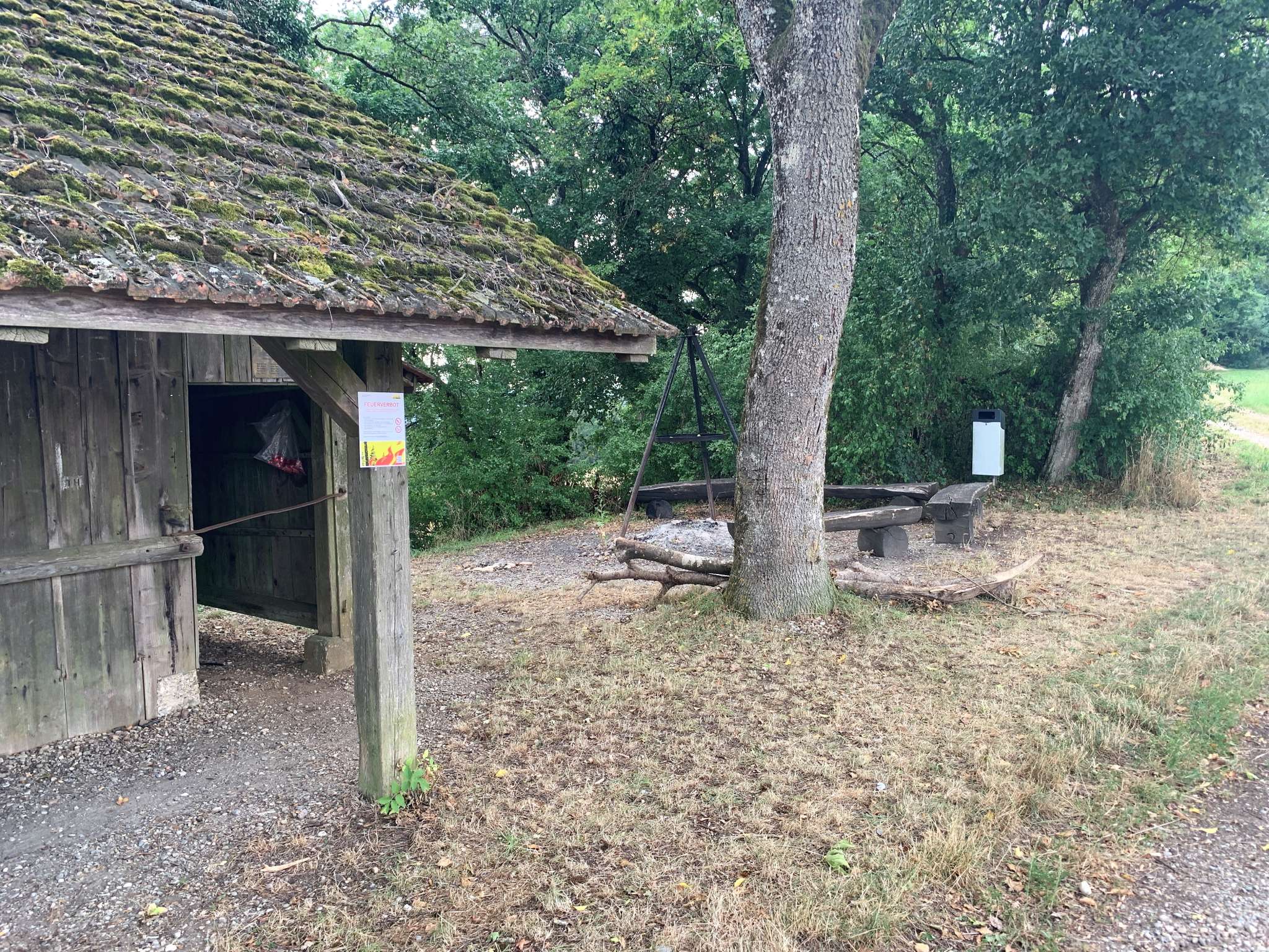 Die Grillstelle Rummele in Oberhallau hat eine offene Feuerstelle mit fünf Holzbänken rundherum. Daneben steht eine kleine Holzhütte mit einem Unterstand.