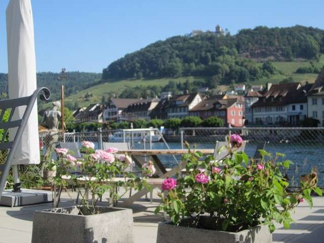 Schöner Garten direkt am Rhein mit verschiedenen Skulpturen, z.B. von Peter Lenk, Carstten Kretschmar, Willi Hofmann, etc. sowie über 65 Töpfe mit Rosen, Rosenbäumchen, Blumen, Sträuchern, etc.