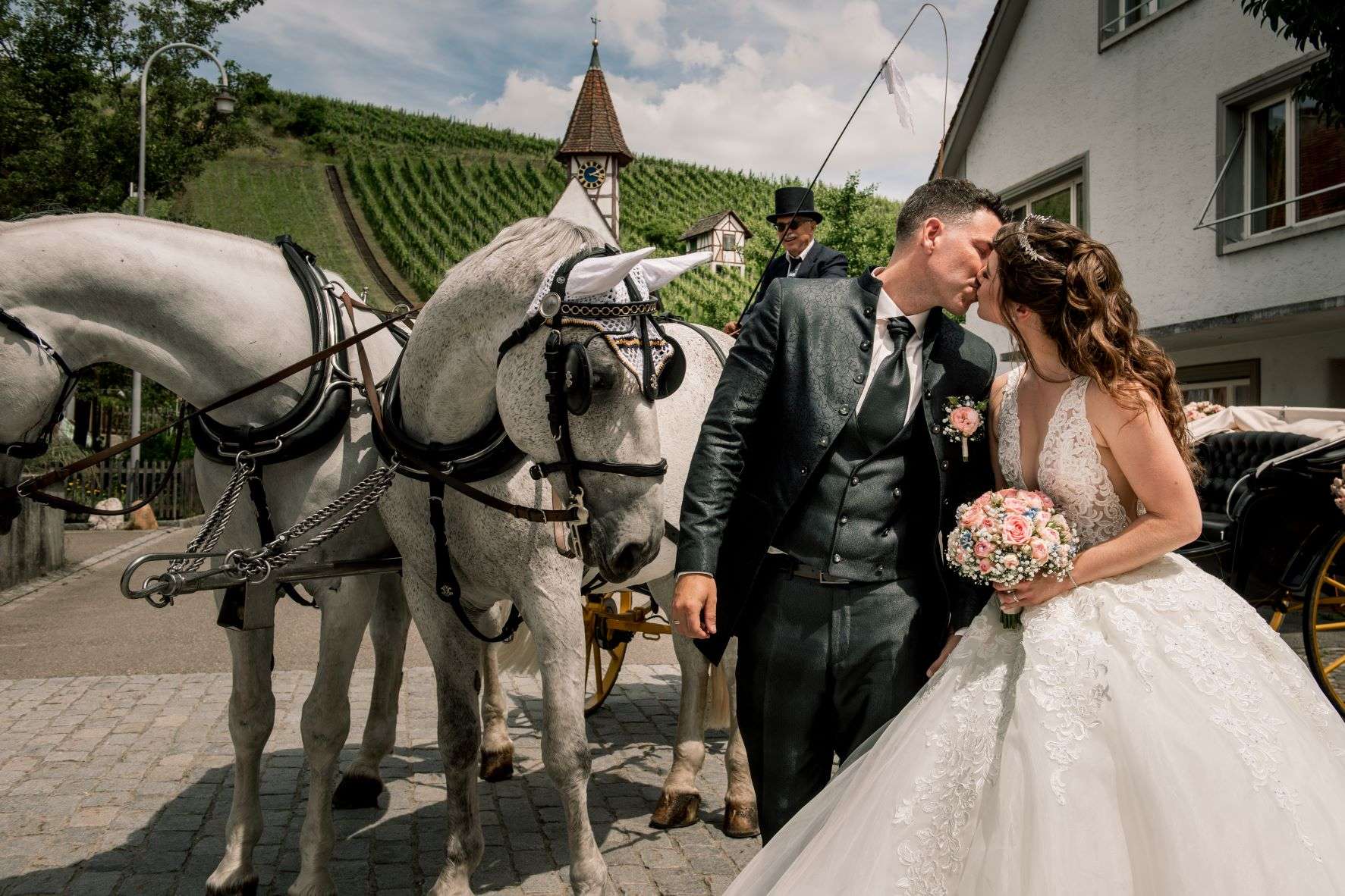 Wir fahren mit reinrassigen Kladruber Pferde, schönen Geschirren aus echtem Leder und original getreu nachgebauten Kuschen mit Scheibenbremsen.