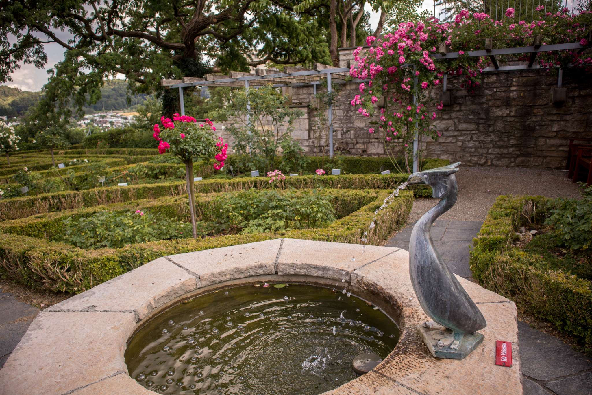 Der circa 300 Quadratmeter große Rosen- und Pfingstrosengarten wurde einst vom Schweizer „Rosenvater“ Dietrich Woessner als Stil- und Prüfgarten prächtig angelegt. Die Rosen wurden durch die Rosenfreunde Schaffhausen 2009 neu gepflanzt. Gleich unterhalb der Rosen wachsen seit 2014 über 90 verschiedene Pfingstrosensarten. Gleich beim Garteneingang wachsen Wildarten, aus denen zahlreichen Sorten gezüchtet wurden. Auch sind zehn Sorten zu sehen, die der 2006 verstorbene Engländer Sir Peter Smithers im Tessin gezüchtet hat.