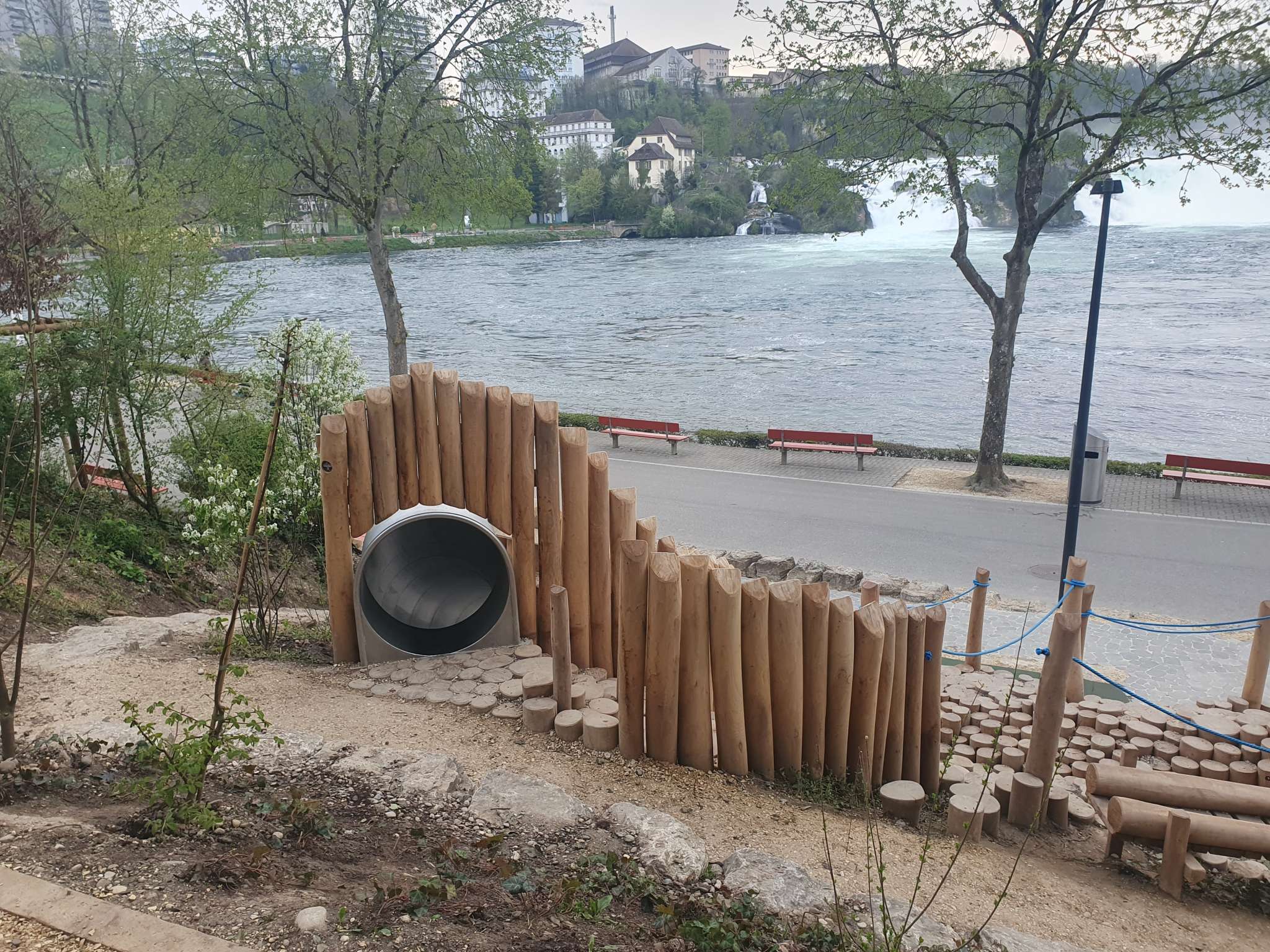 Dieser Spielplatz liegt direkt am Becken des Rheinfalls. Während dem Klettern, Spielen und sich Austoben hört man im Hintergrund das Rauschen der Wassermassen, die den grössten Wasserfall Europas hinunterstürzten. Ein Klettergerüst sowie eine Rutschbahn machen den Besuch am Rheinfall doppelt zum Abenteuer. Ebenfalls hat es gleich daneben auch eine Grillstelle und Tische zum Picknicken und Grillieren.