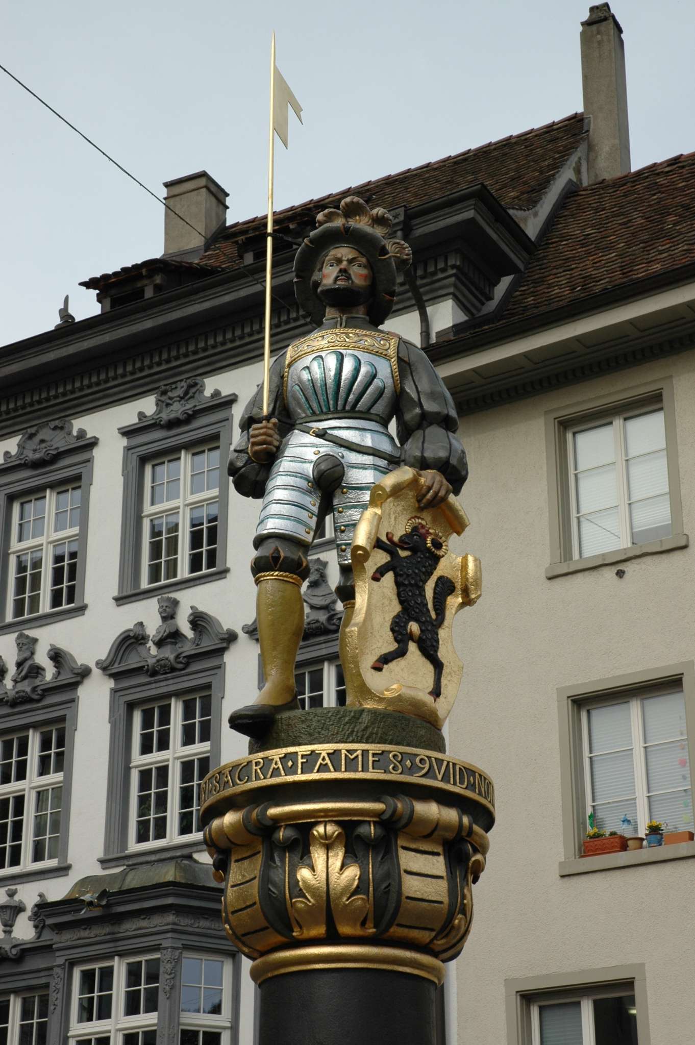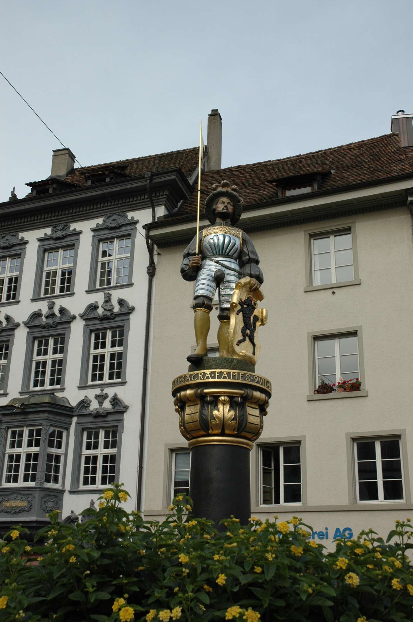 Der Brunnen auf dem Walther-Bringolf-Platz ist über 400 Jahre alt. Er wurde vermutlich 1596 errichtet und im 18. Jahrhundert umgestaltet. Die Säule mit der Landsknechtfigur ist eine Kopie der Statue vom Fischmarktbrunnen, welcher 1840 abgebrochen wurde, und ziert seit 1925 den Walther-Bringolf-Platz-Brunnen.
