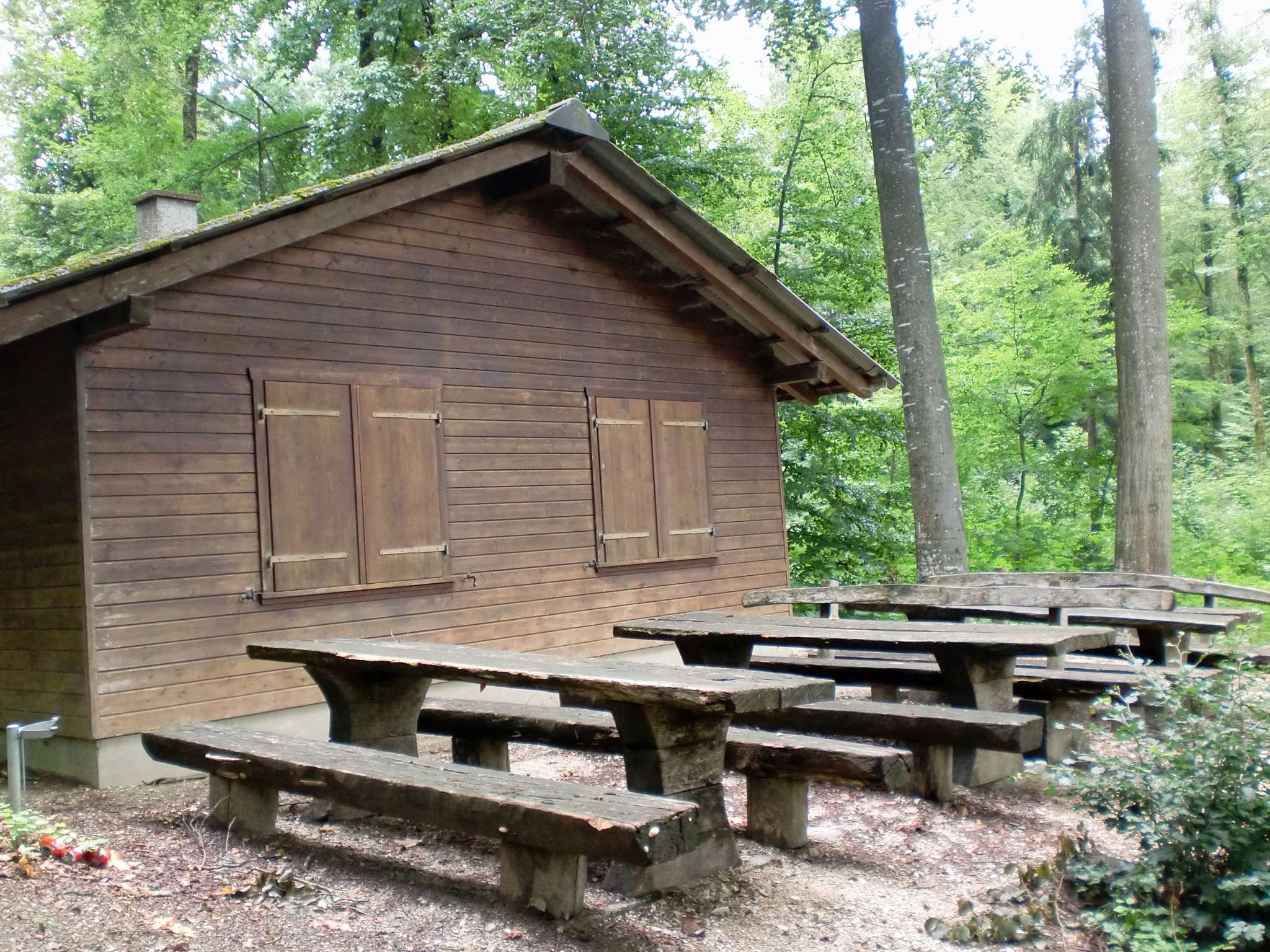 Neben der Hütte hat es eine Grillstelle und diverse Tische und Bänke.