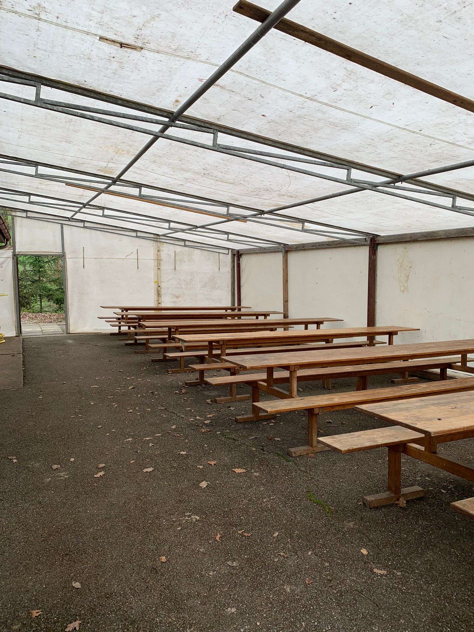 Mit Grillstelle, WCs, Warmwasser, und Küche. Platz drinnen für 40 Personen, im Sommerbetrieb mit bis zu 60 gedeckten Aussenplätzen. Parkmöglichkeit vorhanden.