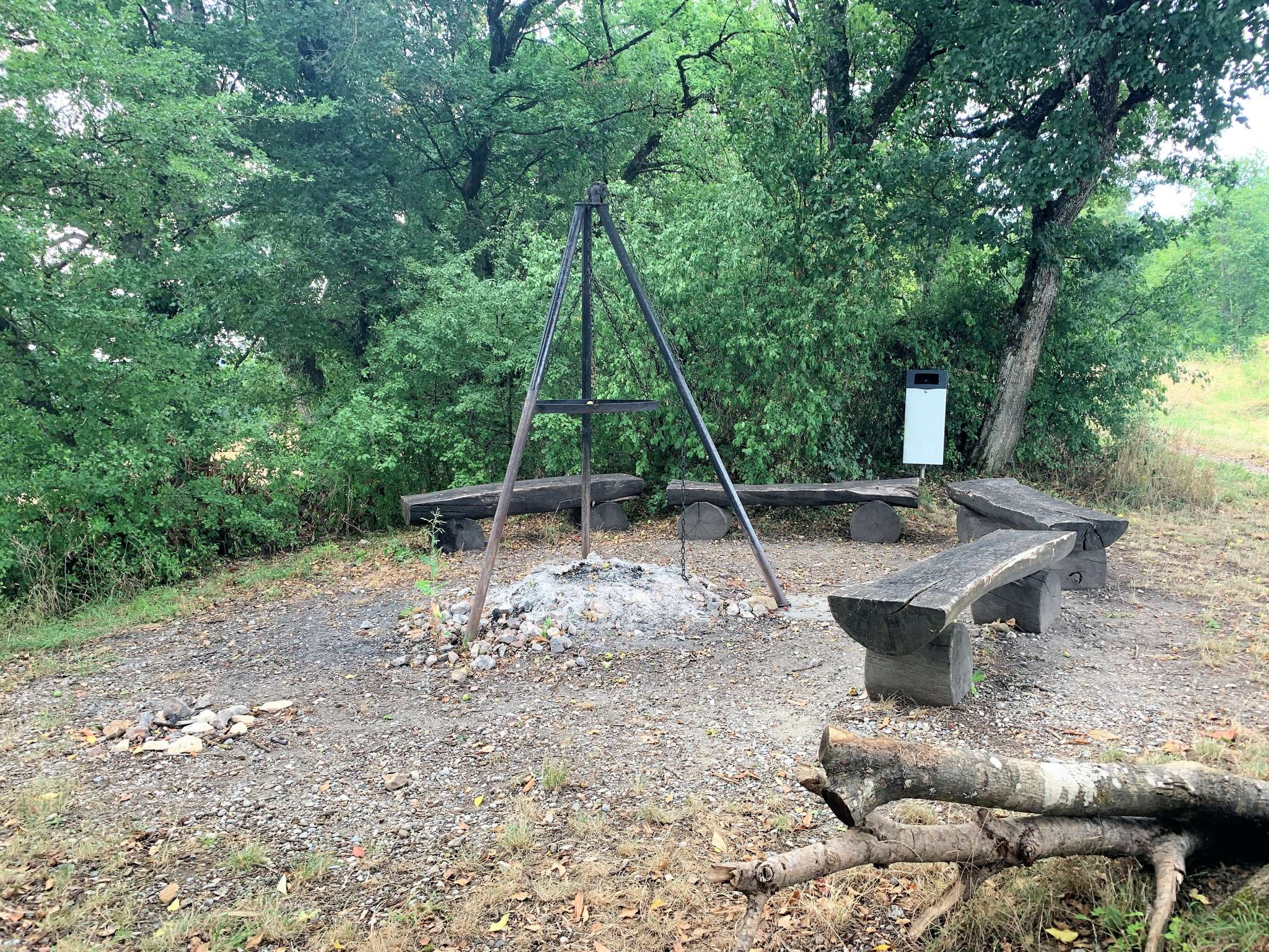 The Rummele barbecue site in Oberhallau has an open fireplace with five wooden benches all around. Next to it is a small wooden hut with a shelter.