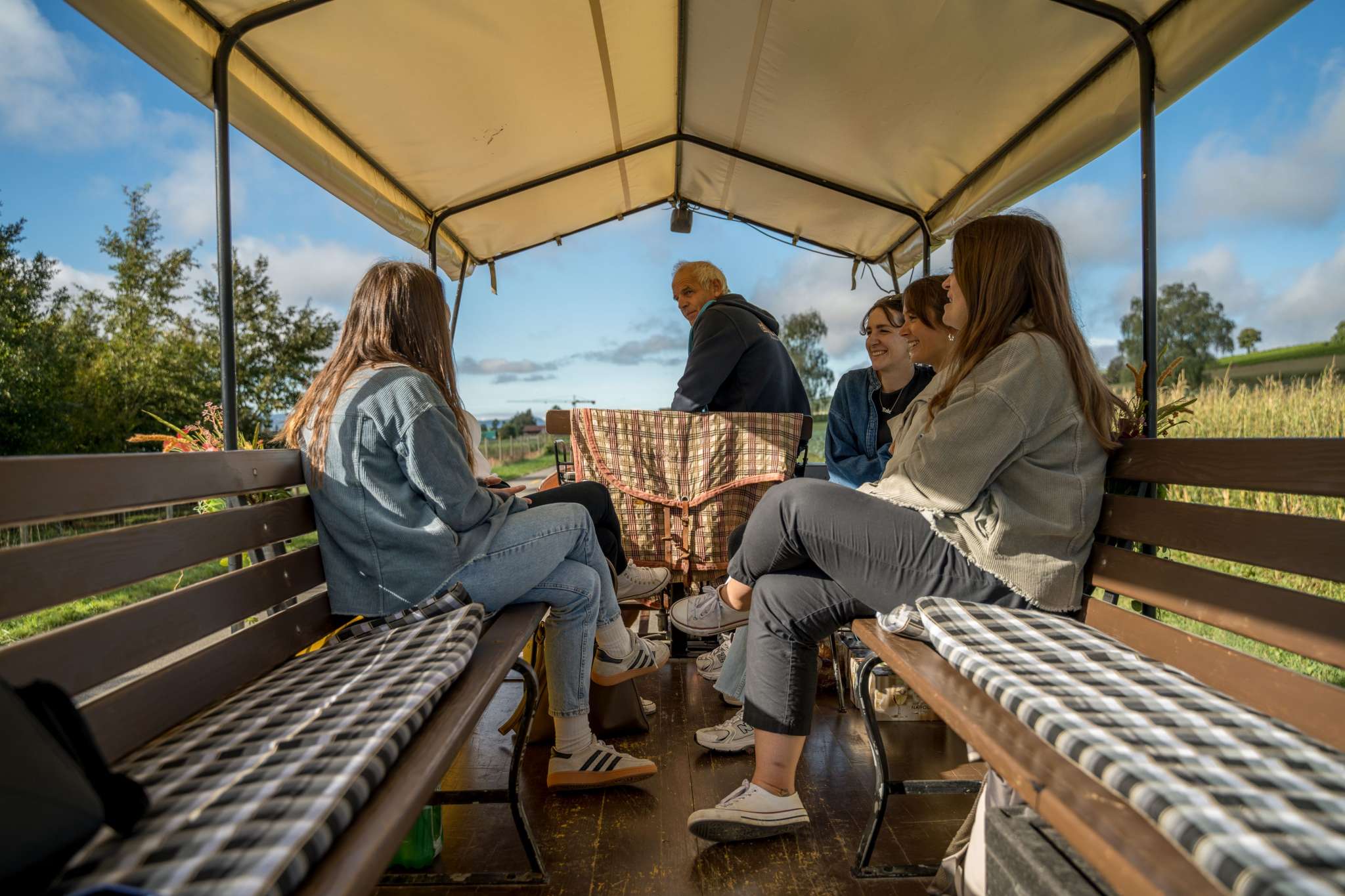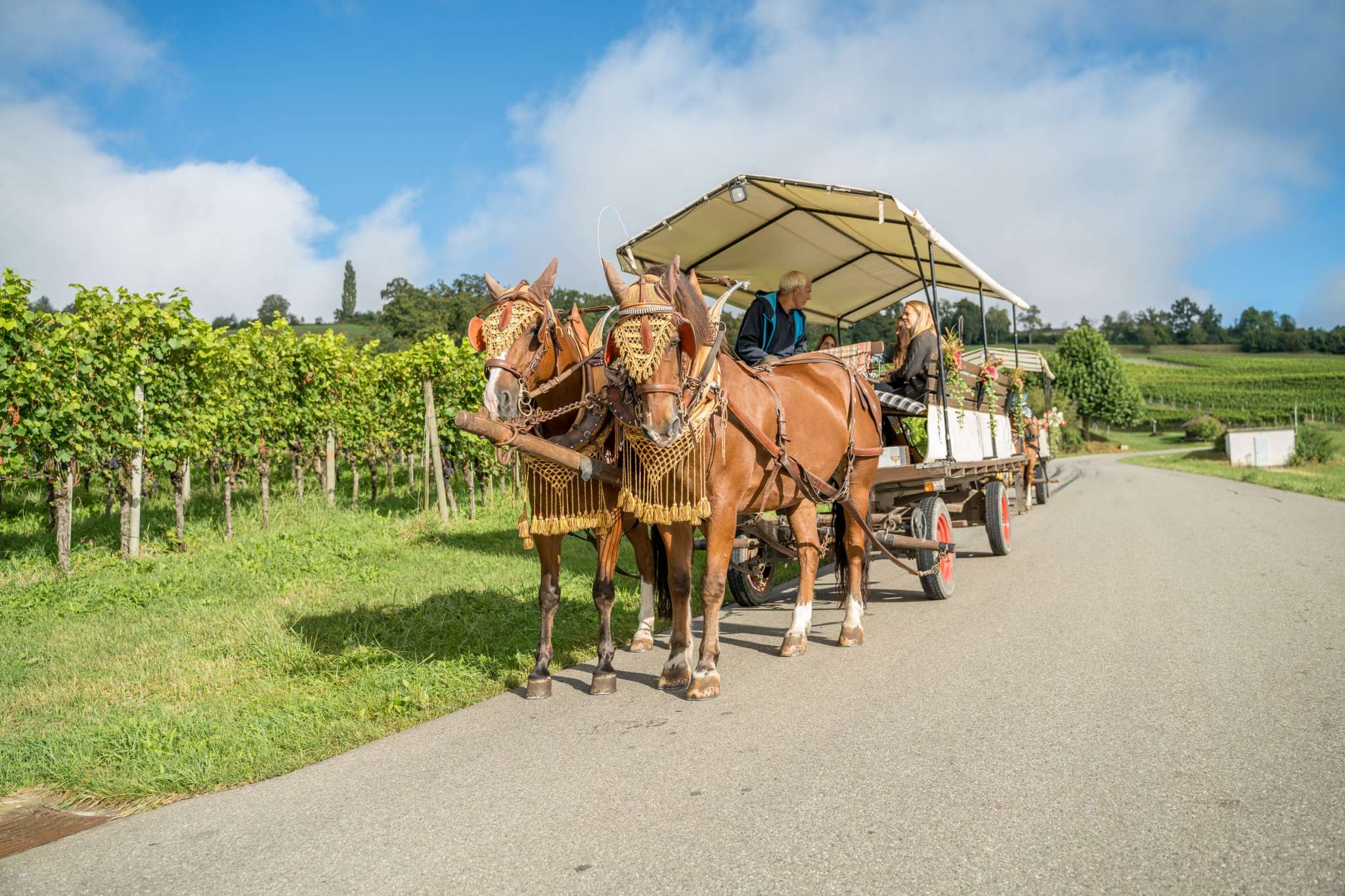 Enjoy a horse-drawn carriage ride through our beautiful vineyards in Schaffhausen's Blauburgunderland.