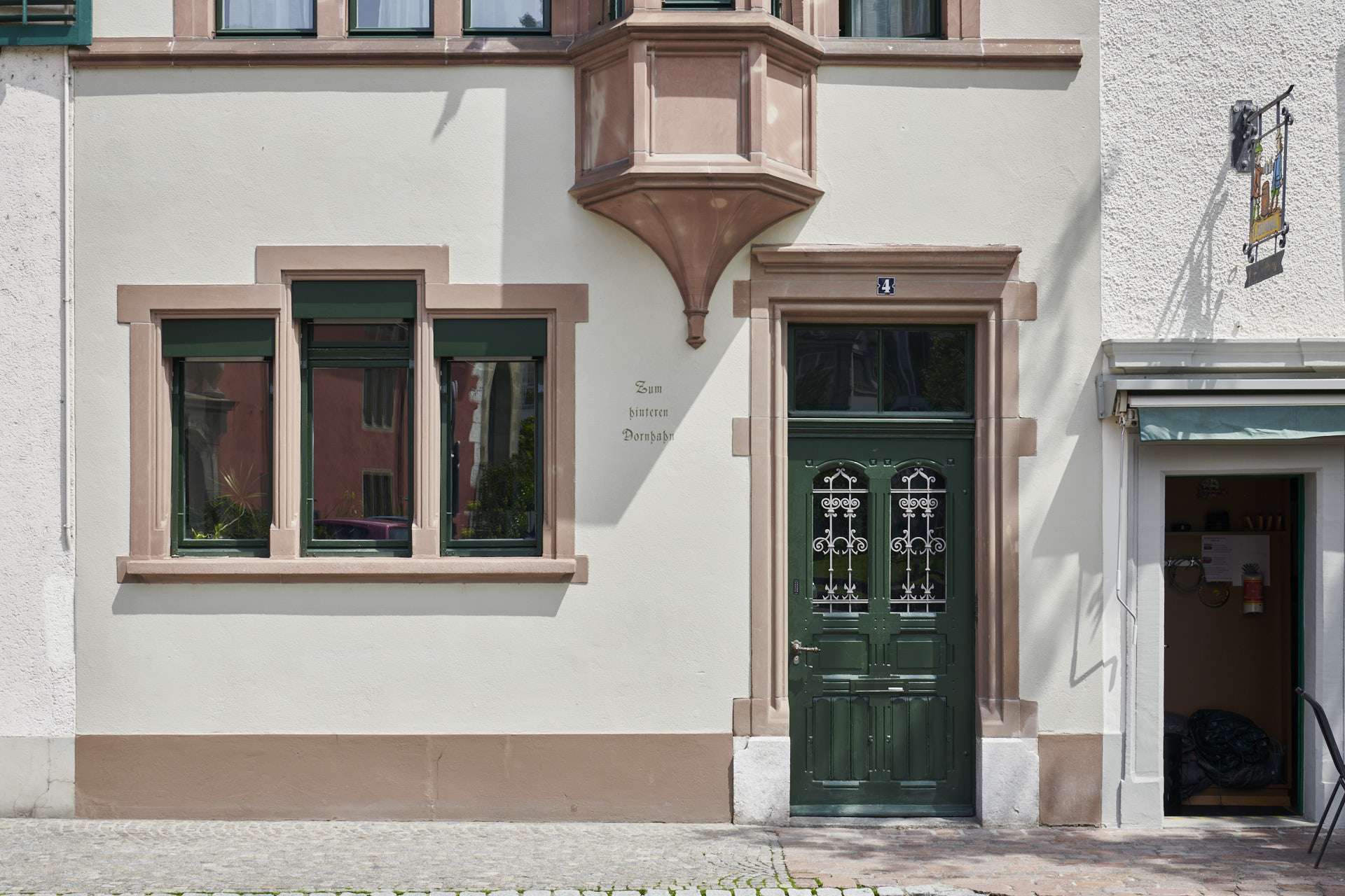 The house "Zum Hinteren Dornhahn" is located in the middle of the old town on Münsterplatz opposite the Allerheiligen monastery, the former religious, cultural and stately center of the town of Schaffhausen. It is one of the typical medieval town houses with a workshop or store on the first floor and apartments on the upper floors. The apartment is located on the second floor with a view of the Mosergarten, just a few minutes' walk from the town's landmark, the Munot, and the popular river baths.