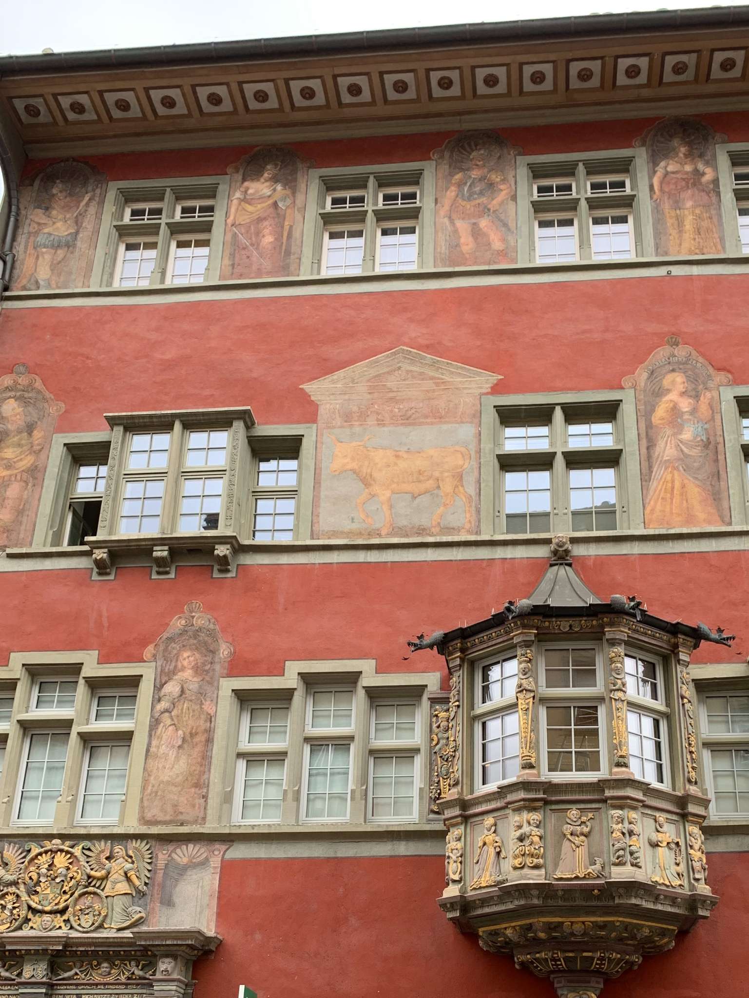 17th century. One of the most grandiose houses of old Schaffhausen, on the site of the old cattle-market. It served until 1608 as a guest house. During remodelling in 1608 into a distinguished town house the late-Gothic façade received some of the splendour of the German Renaissance in the form of bay and portico. The frescoes on the façade show a golden ox as house symbol and personages from Babylonian history and ancient Greece. Above all the heroes of the Trojan war are represented.