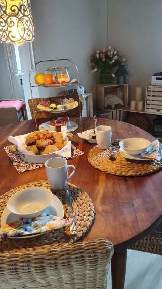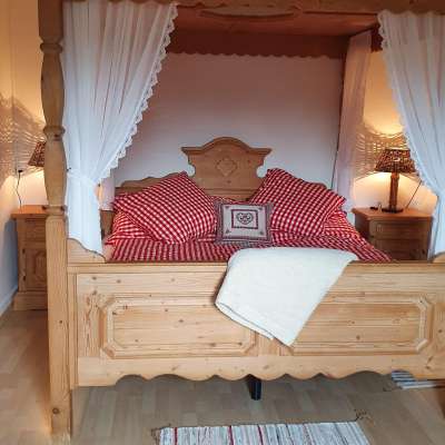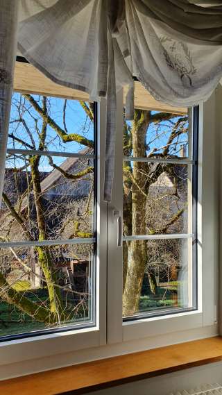 Die kleine aber feine Gästewohnung im ersten Stock verfügt über Himmelbett, Wohnstube, kleine Küche, Bad und Waschmaschine. Auf der Sonnenseite des Randensüdfusses gelegen ist es ein idealer Ausgangspunkt für Wanderungen auf dem Randen und durch die Rebberge, für Weindegustationen in der dorfeigenen Trotte, zum Velofahren, Biken, Motorradtouren, den Rheinfall zu entdeckten und für Schifffahrten auf dem Rhein.