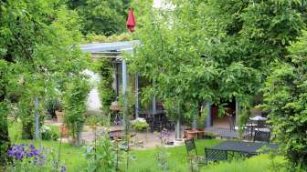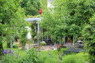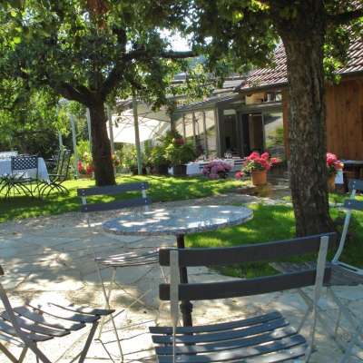 Vom gemütlichen Aufenthaltsraum kommt man direkt in den grosszügigen Blumen- und Obstgarten mit einladenden Sitzplätzen.