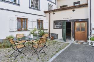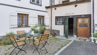 Trotz der dichten Bebauung der Altstadt bietet das Baderhaus einen einladenden Aussenraum, von dem aus man das Treiben in der Hintergasse und am Unteren Brunnen beobachten kann.