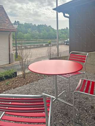 Vor dem Haus befindet sich ein privater Sitzplatz mit Tisch und vier Stühlen, umgeben von Pflanzen. Perfekt für einen Kaffee am Morgen oder ein Glas Wein am Abend. Direkt daneben verläuft der beliebte Rheinwanderweg. So ist das Haus Teil des lebendigen Flussufers und gleichzeitig ein wunderbarer Ausgangspunkt für Spaziergänge, Velotouren und Entdeckungen entlang des Rheins.