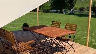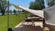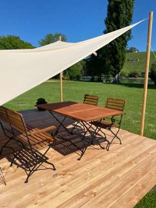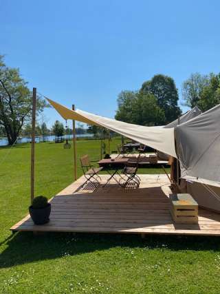 Für ein tolles Glamping-Abenteuer stehen in unmittelbarer Nähe zum Ufer des Rheins drei neue Walden-Mietzelte. Von der gemütlichen Holzterrasse hat man eine wunderschöne Aussicht auf den Rhein und die Natur, welche mit einem Abendessen und einem Glas Wein genossen werden kann. Das Sonnensegel vor dem Zelt spendet Schatten oder auch Schutz bei Regen. Die Zelte befinden sich in der Nähe des Grillplatzes, wo Holz für ein Barbecue oder für ein schönes Lagerfeuer zur Verfügung steht.