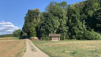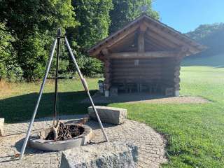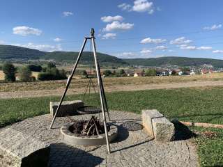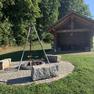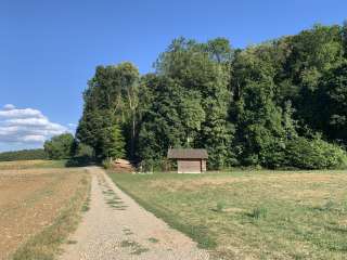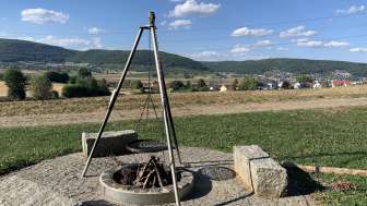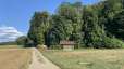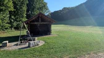Die Feuerstelle, eine Hütte mit einem Tisch und Bänken und eine grosse Wiese ganz in der Nähe des Dorfes Guntmadingen laden zum Verweilen ein.