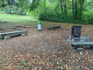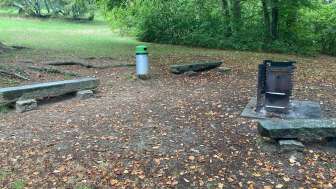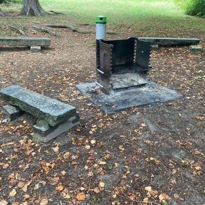 Eine kleine Grillstelle mit Feuerstelle und mehreren Steinbänken.