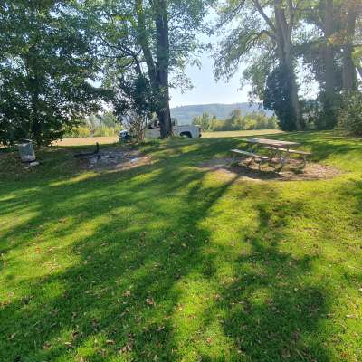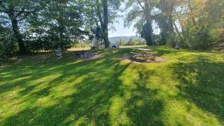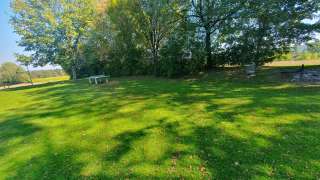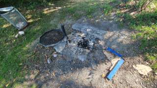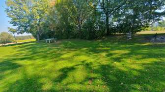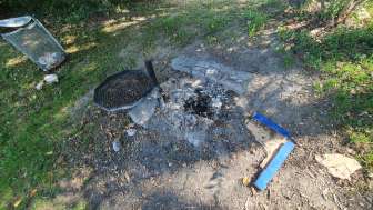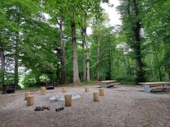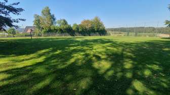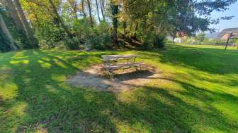 Es hat eine Feuerstelle und einen Tisch mit Bänken. Gleich daneben befindet sich eine Wiese mit einem Fussballfeld.