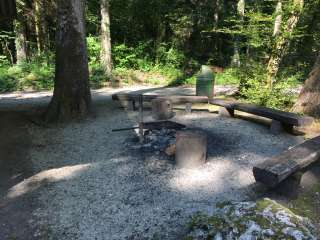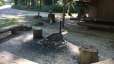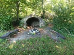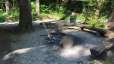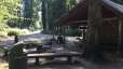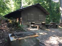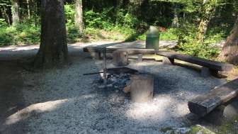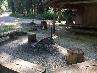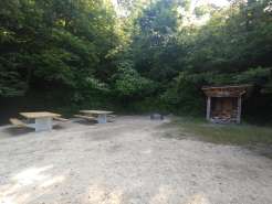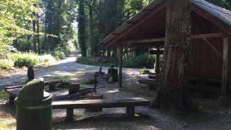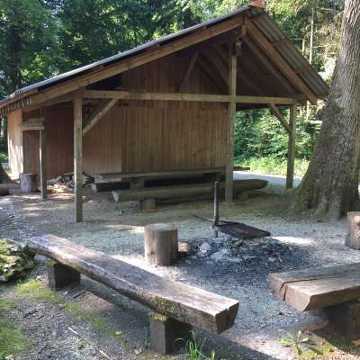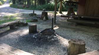 Die Grillstelle hat eine Feuerstelle mit Bänken rundherum. Daneben steht eine Hütte mit einem Unterstand, der genutzt werden kann.