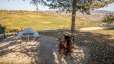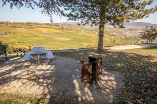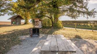 Neben einer Feuerstelle, zwei Tischen mit Bänken sowie schattenspendenden Bäumen hat es auch Holz (ohne Gewähr).