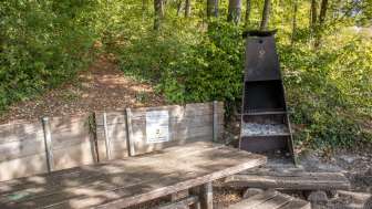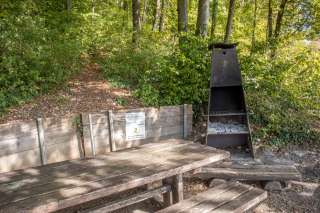 Sie ist mit einer gedeckten Feuerstelle und einem Tisch mit zwei Bänken sowie einer Bank, um die Aussicht zu geniessen, ausgestattet.