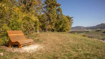 Die Holz-Liegebank lädt zum Aussicht geniessen und Sonne tanken ein.