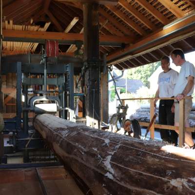 Führungen durch die neue Ausstellung „Säger“ mit einem Kurzfilm zum Beruf. Die Besucher erfahren viel über den Holzkauf, das Sägen von Balken, Brettern und Latten. Neu eingerichtete Transmission. Sägebetrieb mit der 90-jährigen Gattersagi: Dauer: 1 ½ Stunden.