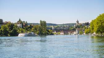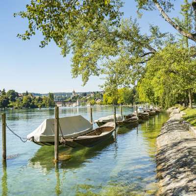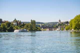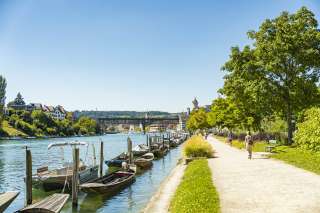 Die Schaffhauser Flaniermeile befindet sich direkt am Rhein. Unter schattenspendenden Bäumen trifft man hier bei schönem Wetter Paare und Familien mit Kind und Kegel.