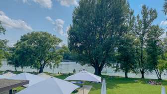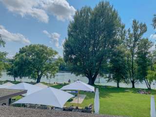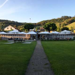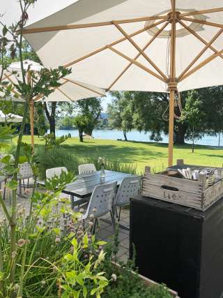 Strandbad mit einer grossen Badewiese direkt am Rhein und altem Baumbestand mit Kinderspielplatz, Kinderplanschbecken mit Sonnensegel, Sprungturm (nur bei Badeaufsicht zugänglich - an den Wochenenden und während den Sommerferien), Volleyballfeld sowie dem Café «Uferlos» mit vielen Köstlichkeiten und speziellem Ambiente.