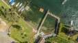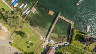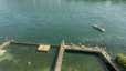 Die Holzumrandung mit Steg bietet Schutz vor der Strömung und Tiefen des Rheins.