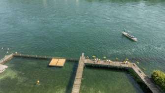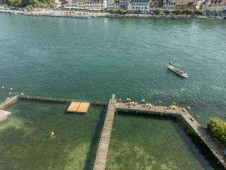 Eine Badi für Familien, Kinder und alle die das Wasser lieben. Die Holzumrandung mit Steg bietet Schutz vor der Strömung und Tiefen des Rheins. Im Innern ist eine Wasseraufsicht gewährleistet. Das Schwimmen im offenen Rhein kann auf eigene Gefahr unternommen werden.