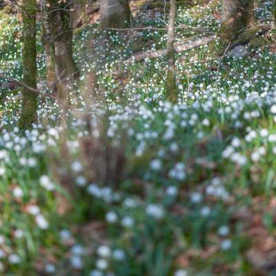 Im Frühling, kurz nach der Schneeschmelze, blühen im Waldgebiet des Naturschutzgebiet Auenwald die Märzenbecher zu Tausenden in voller Pracht.