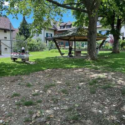 Auf dem kleinen Spielplatz befindet sich ein Kletterturm mit Rutsche und eine Schaukel. Der gedeckte Pavillon ermöglicht eine Zvieripause bei jeder Witterung.