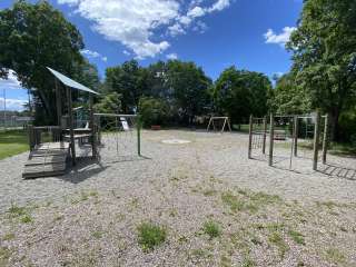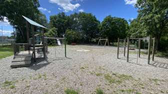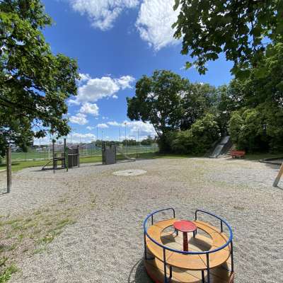 Spielplatz mit vielen spannenden Spielelementen für jedes Alter: Rutsche, Spielturm, Klettergerüst, Kinderkarussel, Sandbereich, Tischtennisplatte und vieles mehr.
