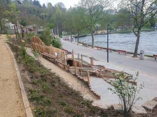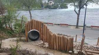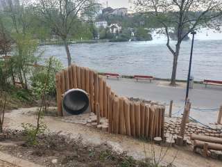 Dieser Spielplatz liegt direkt am Becken des Rheinfalls. Während dem Klettern, Spielen und sich Austoben hört man im Hintergrund das Rauschen der Wassermassen, die den grössten Wasserfall Europas hinunterstürzten. Ein Klettergerüst sowie eine Rutschbahn machen den Besuch am Rheinfall doppelt zum Abenteuer. Ebenfalls hat es gleich daneben auch eine Grillstelle und Tische zum Picknicken und Grillieren.