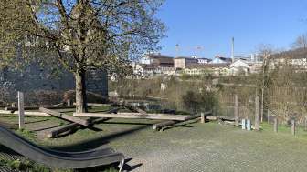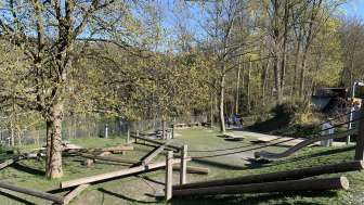 Ein kleiner Spielplatz mit Rutschbahn, Kletterseilen und Balancierbalken beim Schloss Laufen lädt zum Austoben ein.