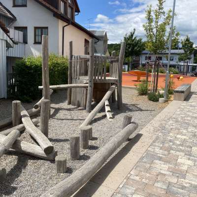 Spielplatz auf dem für jedes Kind etwas Spannendes vorhanden ist: Klettergerüst, Sandfläche, Trampolinbereich, Balancierbereich und vieles mehr.