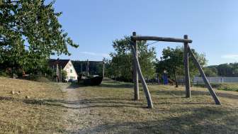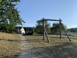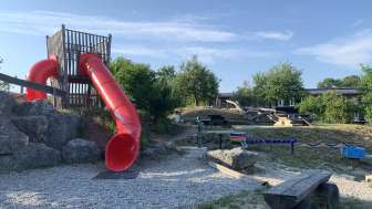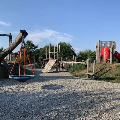 Ein Klettergerüst, eine Rutschbahn, Schaukeln, eine Seilbahn, eine Pumpe mit Wasserlauf und ein alter Holweidling lassen alle Kinderaugen aufleuchten.