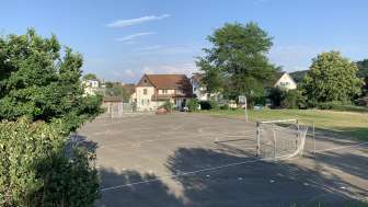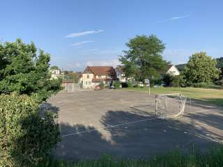 Für die Grösseren hat es einen Hartplatz mit Basketballkorb und Fussballtoren sowie einen Ping Pong Tisch.