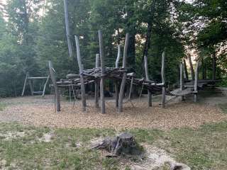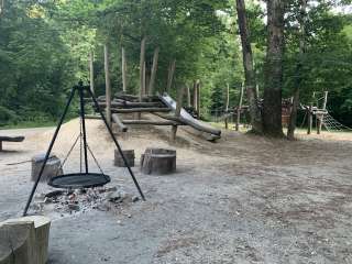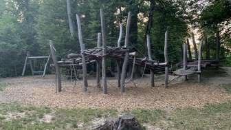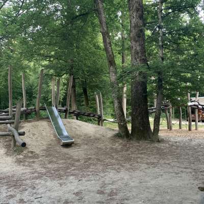 Der grosse Spielplatz liegt in einem schönen Waldstück in Stadtnähe. Ein Klettergerüst mit Rutschbahn verspricht Spass für die Kinder.